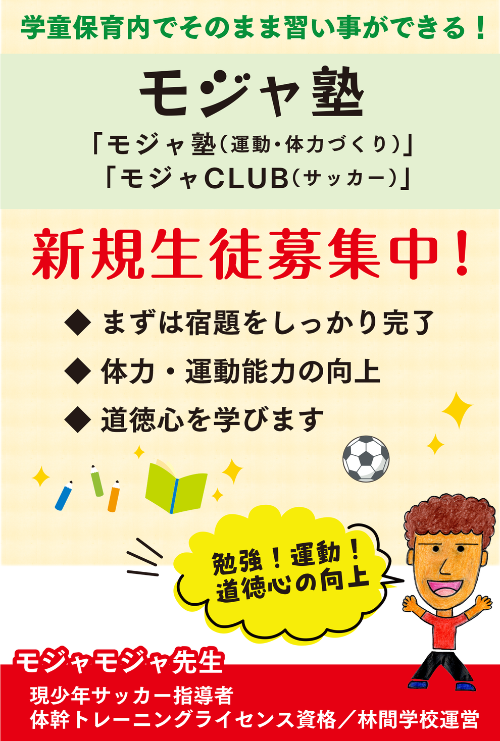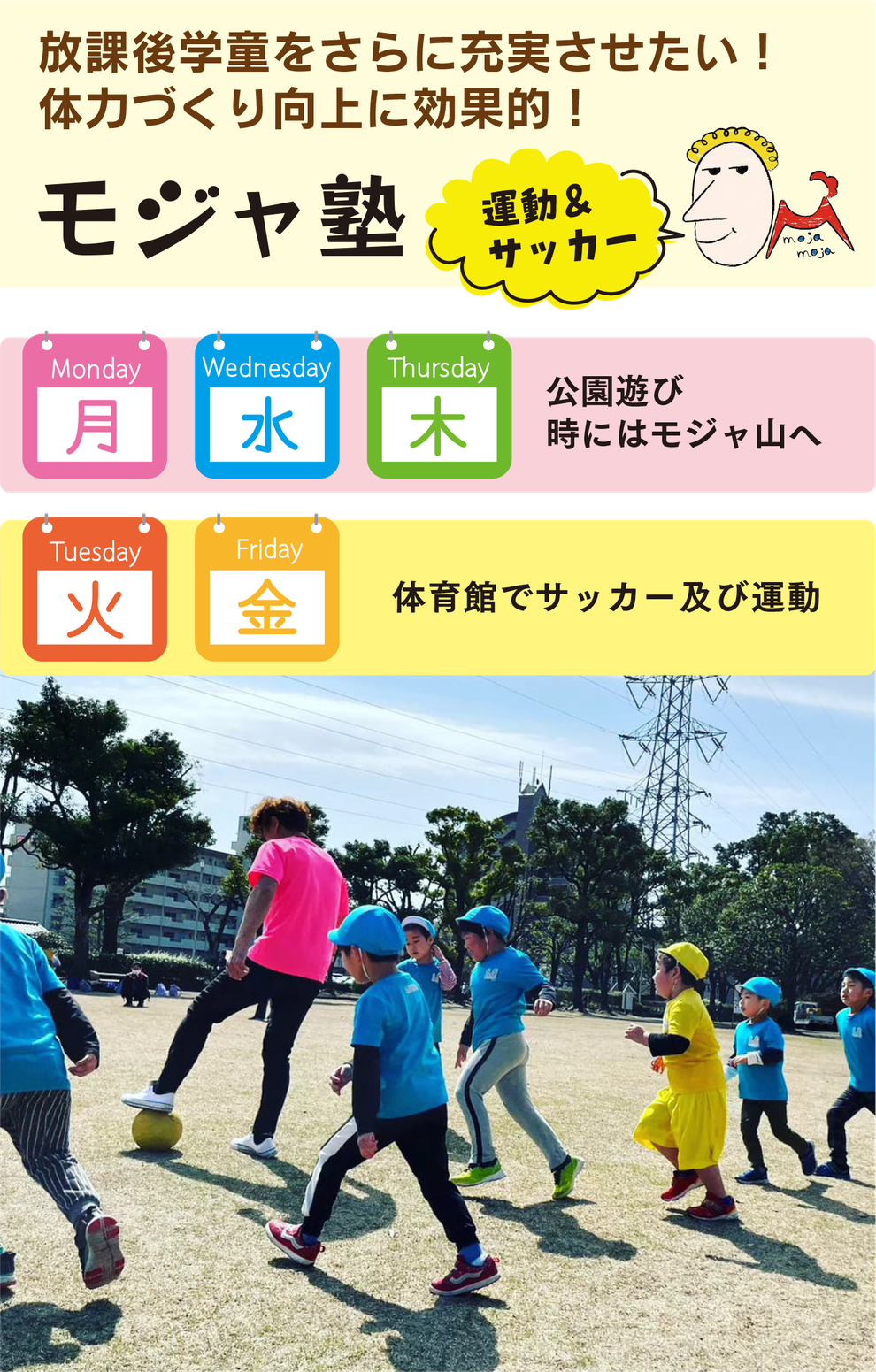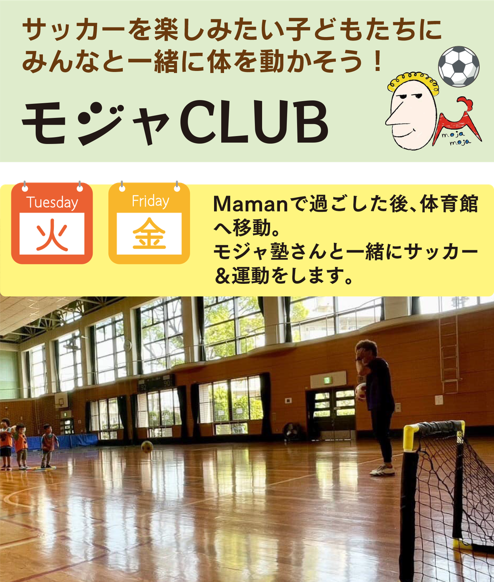 モジャモジャ先生の指導のもと体力づくりに取り組む「モジャ塾」やサッカーに特化した「モジャCLUB」などのコースがあります。